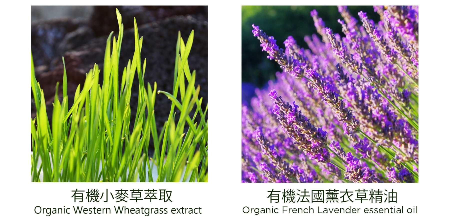 • 有機小麥草萃取: 良好的皮膚清潔劑, 具有溫和去角質特性