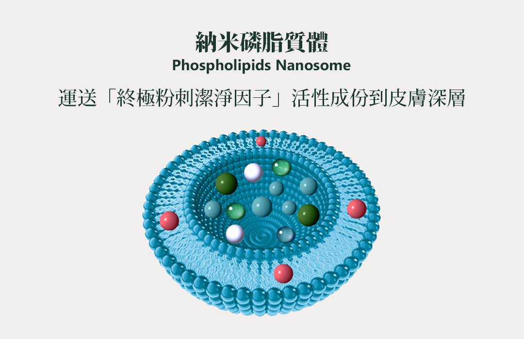 納米磷脂質體運送「終極粉刺潔淨因子」活性成份到皮膚深層, 帶來強效持久的淨肌, 皮脂平衡, 抗炎及舒緩效果. 其高濃度強效美肌生物科技成分能溫和及有效地改善肌膚問題, 減少紅印, 鎮靜消炎及協助皮膚復原: