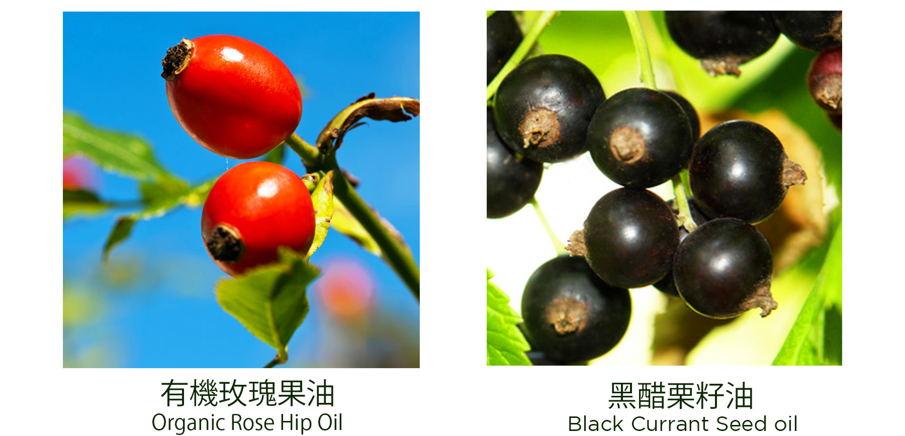 • 黑醋栗籽油:富含γ-亞麻酸, 促進皮膚修復