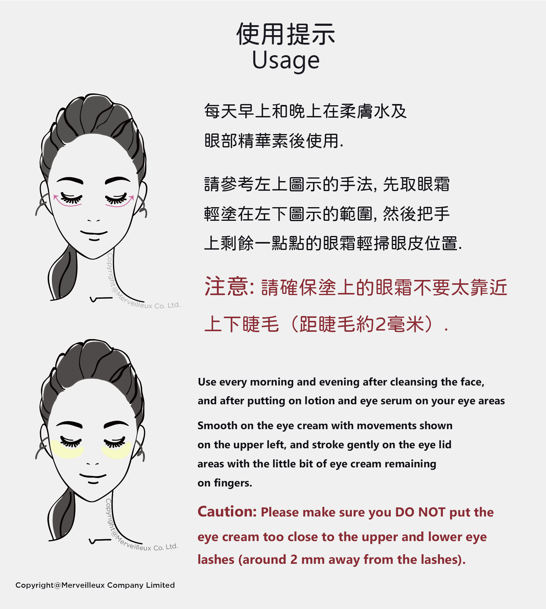 • 橙皮苷甲基查爾酮, 棕櫚醯四肽-3 & 二胜肽 : 幫助增強眼部皮膚, 降紅和減輕黑眼圈