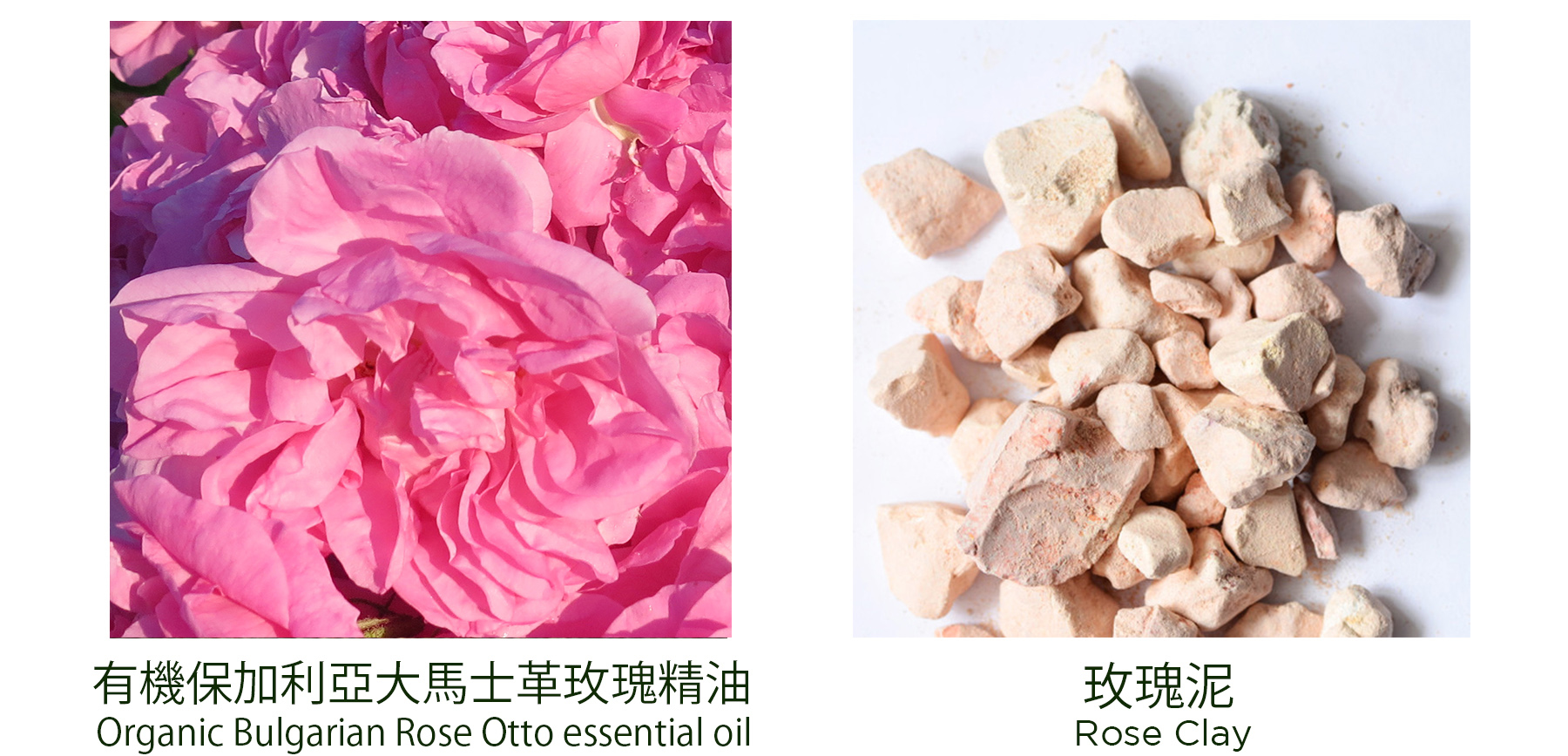 • 玫瑰泥: 幫助收緊毛孔、排毒、吸收過盛油脂。使皮膚感覺清新。亦有助促進細胞修護及皮膚更新