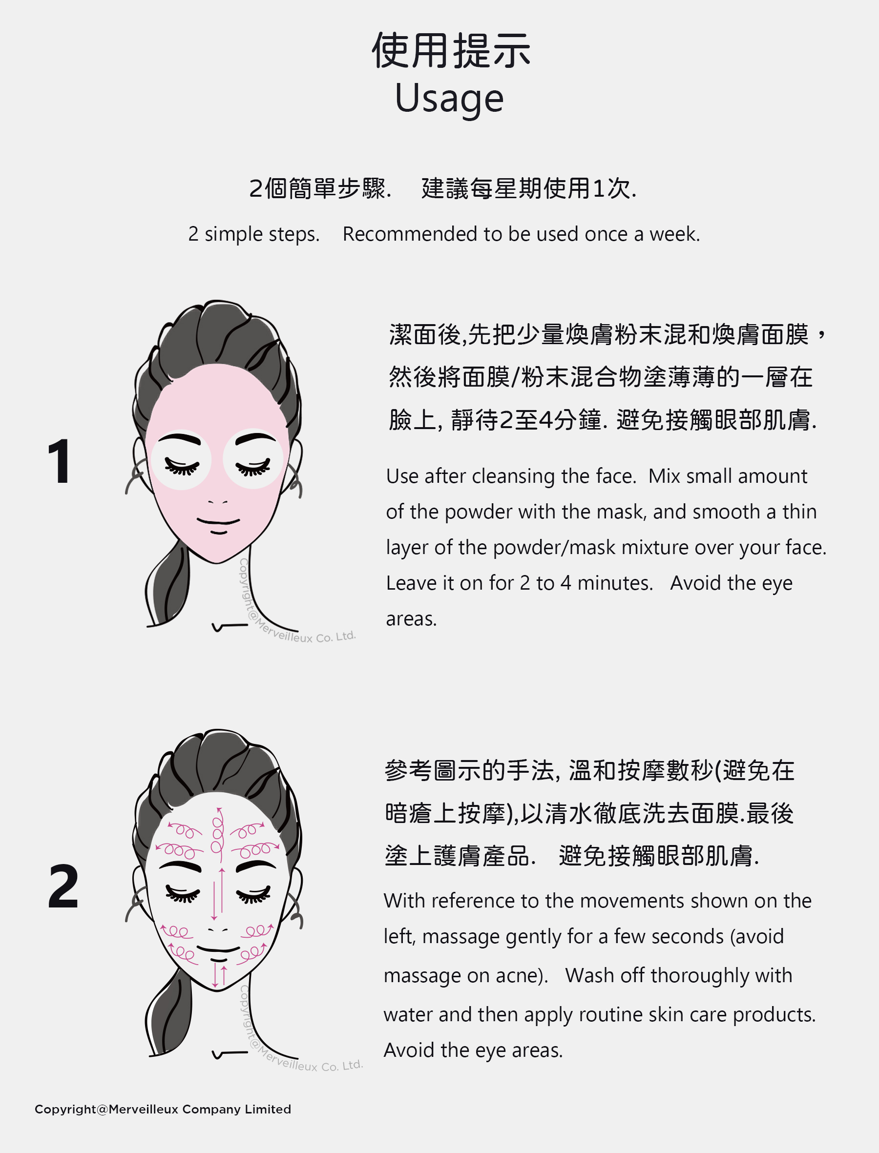 潔面後,先把少量煥膚粉末混和煥膚面膜,然後將面膜/粉末混合物塗薄薄的一層在臉上,靜待2至4分鐘後, 溫和按摩前額 / 鼻部 / 下巴的皮膚數秒 (避免在暗瘡上按摩) , 以清水徹底洗去面膜。 最後塗上護膚產品。