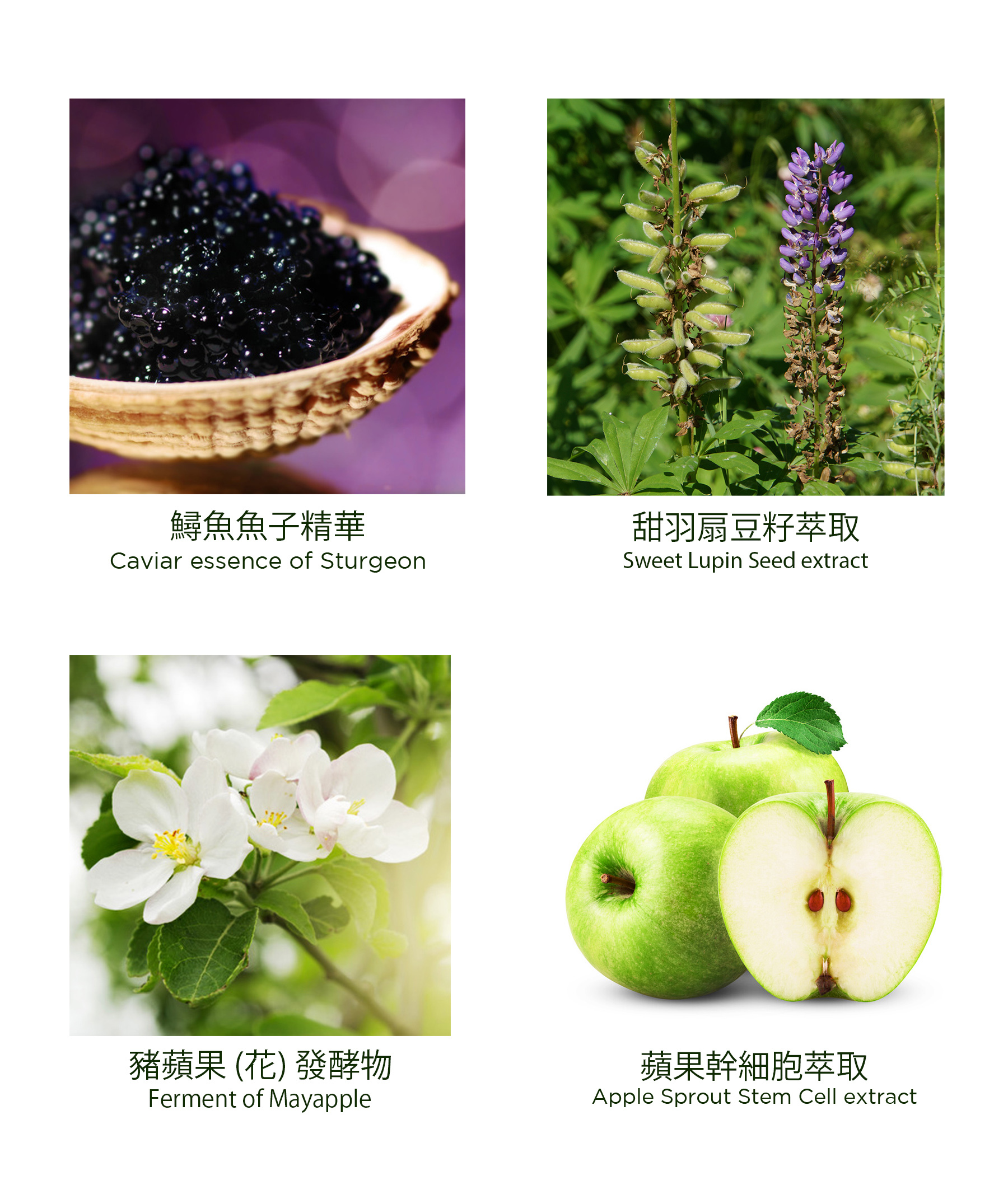 • 蘋果幹細胞: 良好的抗氧化劑, 滋養皮膚, 並有助皮膚再生