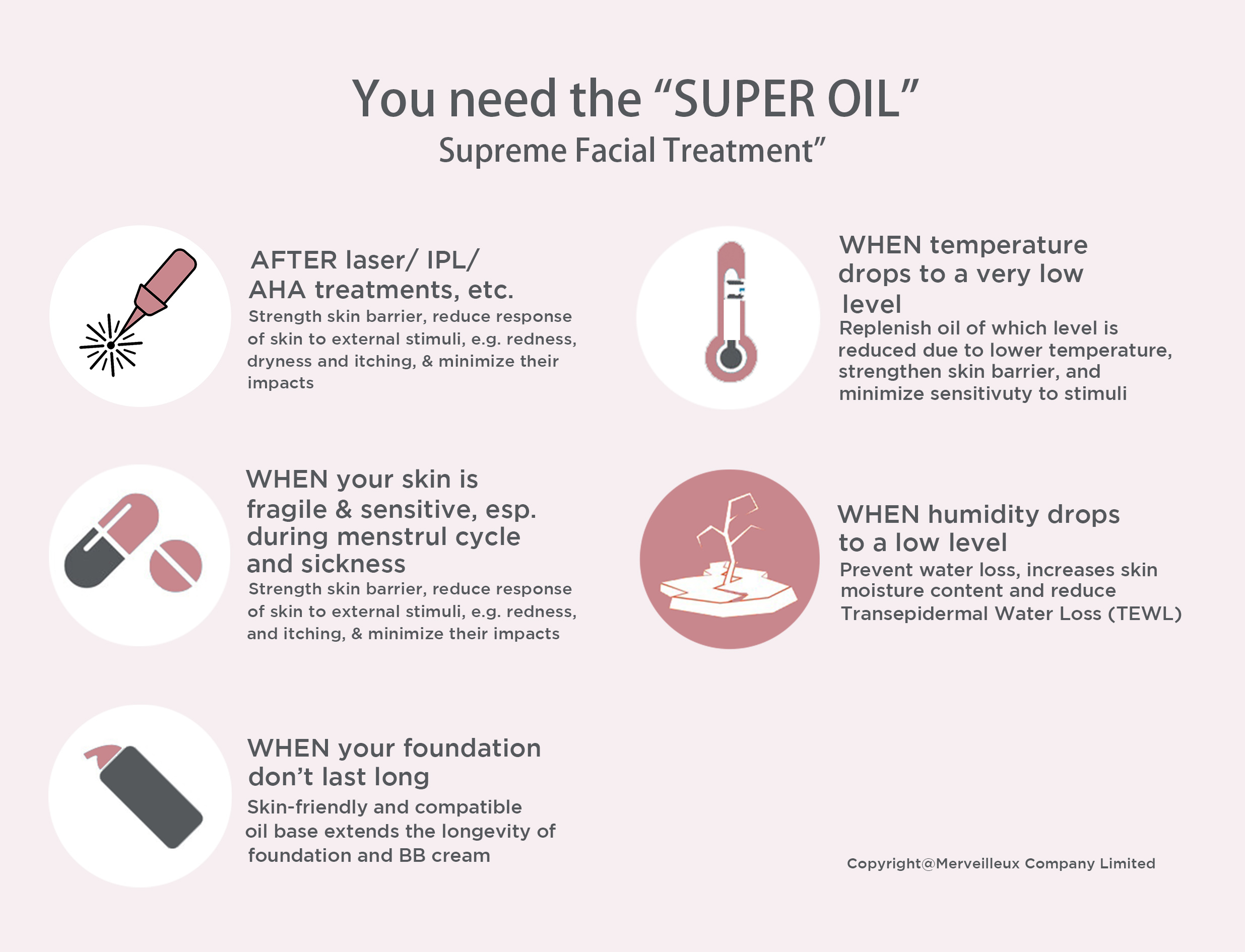 This oil nourishes dry/dehydrated skin, prevent water loss, increases skin moisture content and reduces the Transepidermal Water Loss Level (TEWL). It also helps strength the skin barrier of sensitive and fragile (mostly caused by lack of proper care after laser and IPL Intense Pulsed Light treatments or AHA facials, etc.) skin,and reduce the response of the skin to external stimuli, such as redness,dryness and itching, thus minimize the impact of these stimuli.