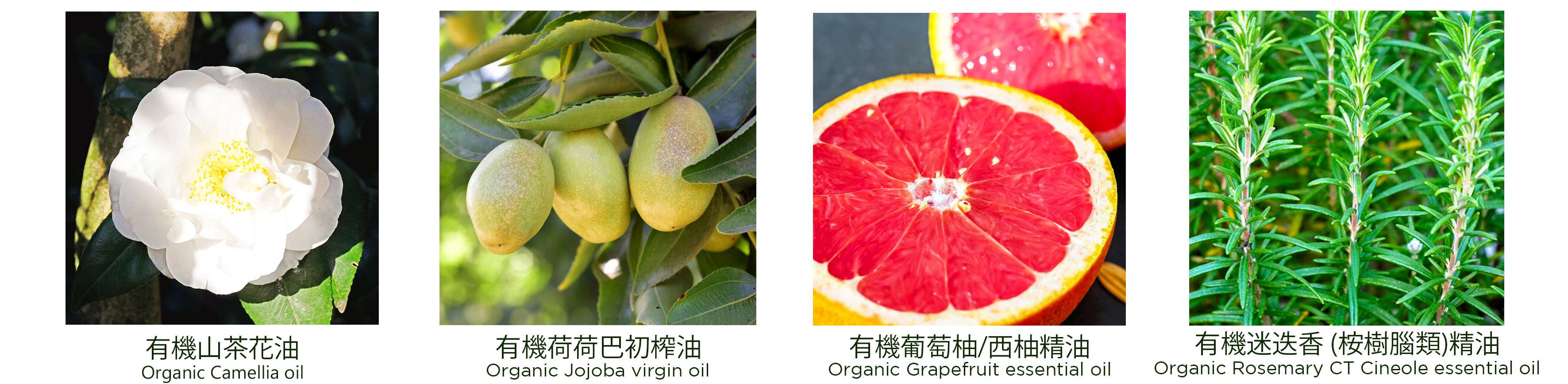 有機山茶花油, 有機初榨荷荷芭油,有機初榨向日葵花籽油, 有機杜松果精油, 維他命 E, 有機迷迭香 (桉樹腦類)精油,有機薰衣草精油, 有機絲柏精油& 有機葡萄柚/西柚精油