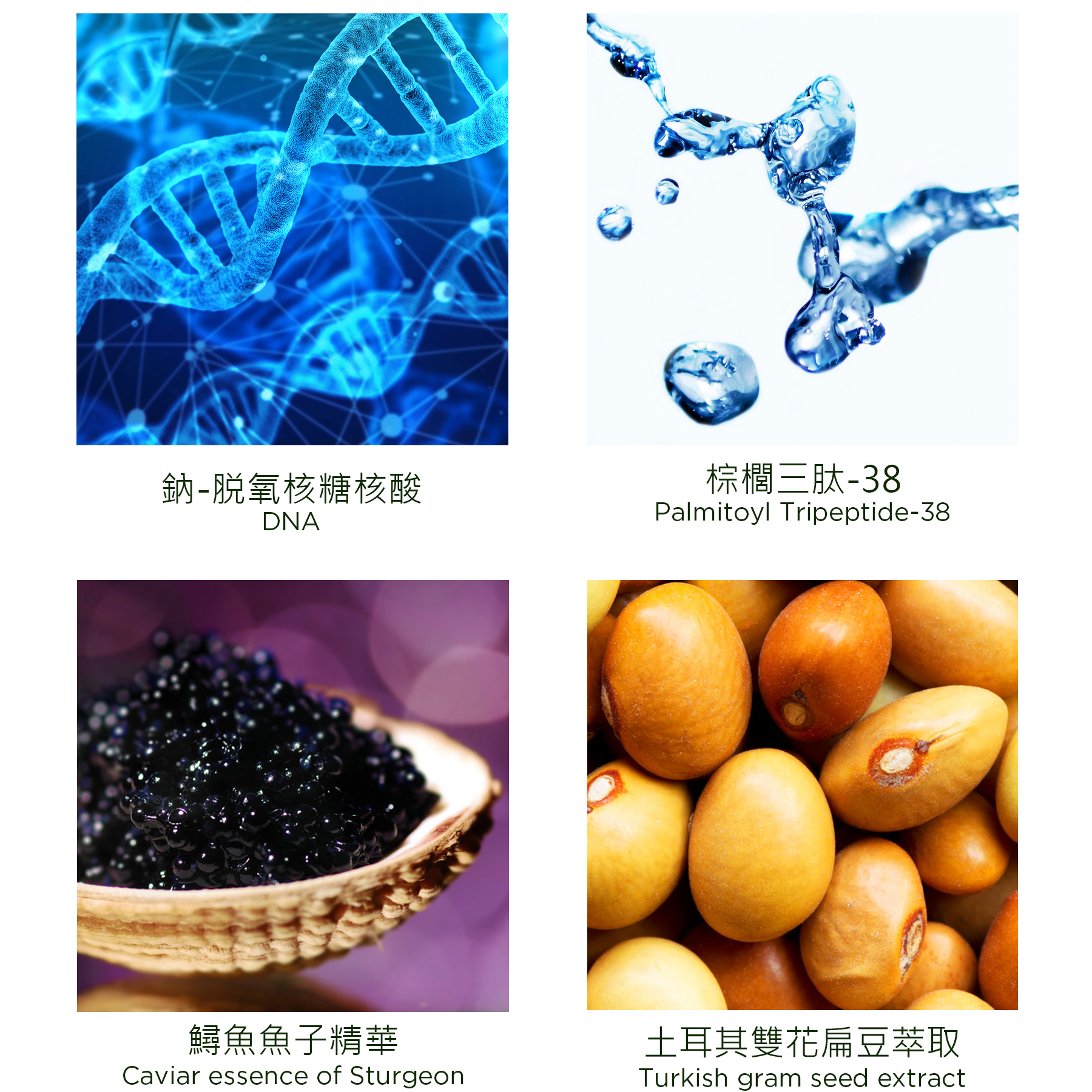 • 鈉-脱氧核糖核酸 (DNA): 先進的生物技術成果. 它具強效抗老化特性及10,000倍的鎖水能力達, 幫助減淡乾紋, 刺激膠原蛋白生產, 促進細胞再生