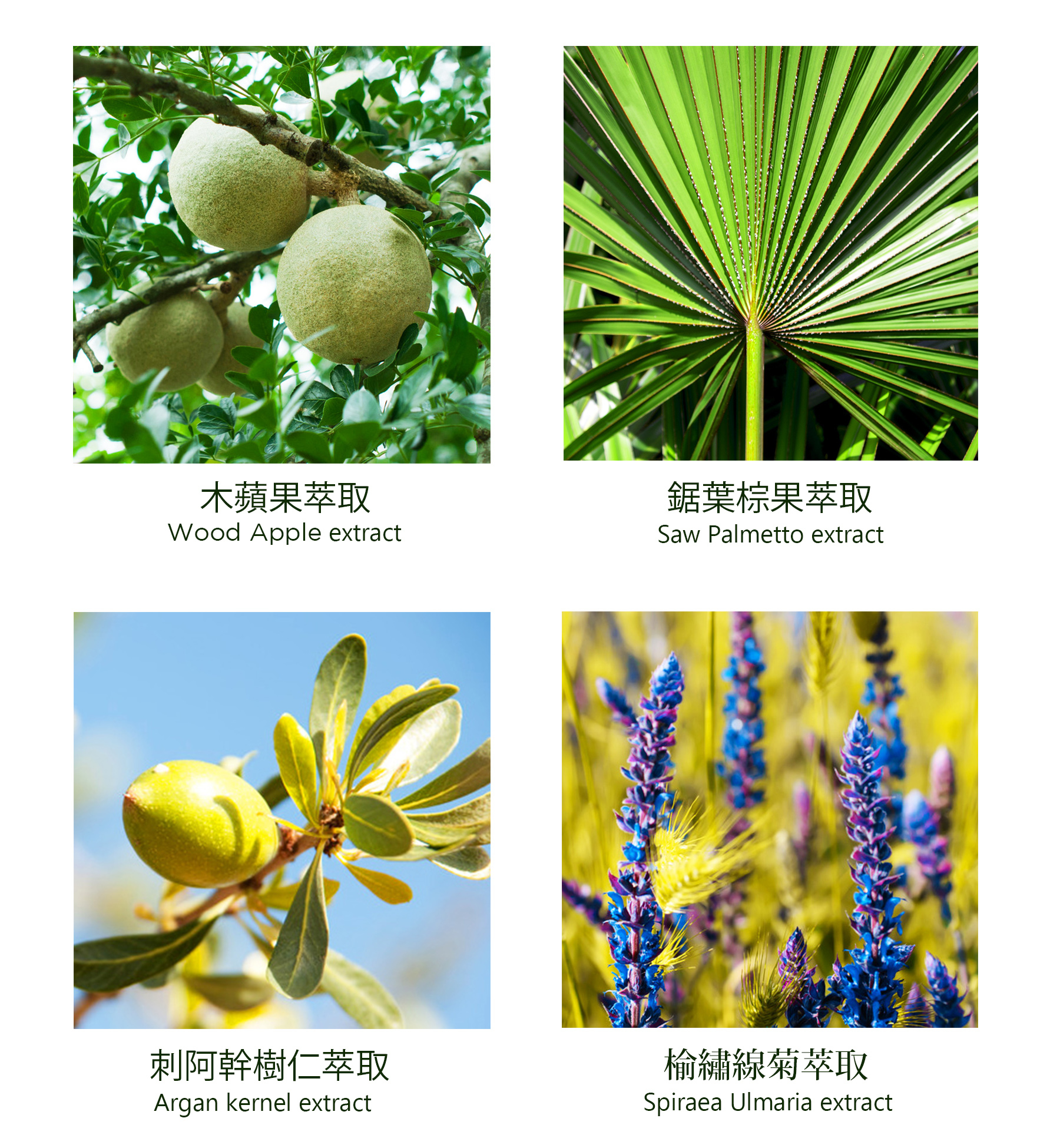 • 刺阿幹樹仁萃取, 榆繡線菊萃取, 鋸葉棕果萃取& 芝麻籽萃取 : 天然萃取组合, 其強效的抗氧化劑, 茶多酚, 包括木脂素和單寧酸, 有助改善皮脂平衡, 減少油脂分泌過多,並細化毛孔
