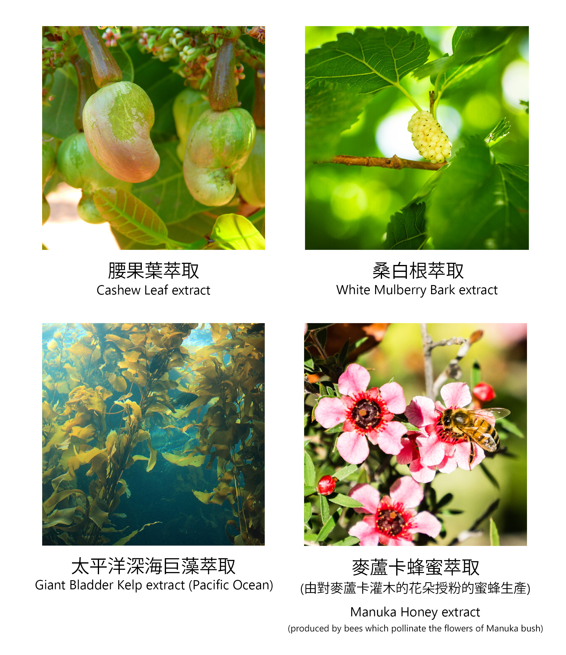• Manuka honey extract: naturally nutrient-rich, produced by bees which pollinate the flowers of Manuka bush. It nourishes the skin and helps improve its barrier effect and resiliency. It also helps soothe the skin and reduce irritation, with its anti-inflammatory property